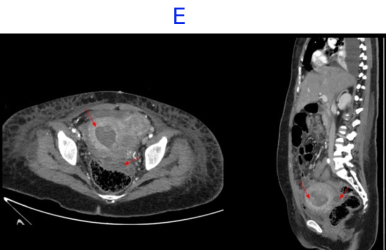 - D. Bulky uterus with a hypodense submucosal lesion protruding into the endometrial cavity from the fundus showing heterogeneous enhancement - infected vs infarcted fibroid. Abnormally enhancing endometrial lining with hypodense content within the endometrial cavity - possible endometritis with pyometra. Pelvic peritonitis with residual trace fluid in the pelvis. Interval resolution of pneumoperitoneum. Abdominal drains in situ.