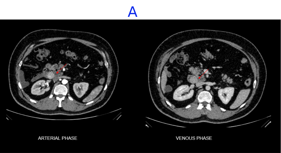 A. A well-defined, heterogeneously enhancing lesion seen in the D3 segment of the duodenum.