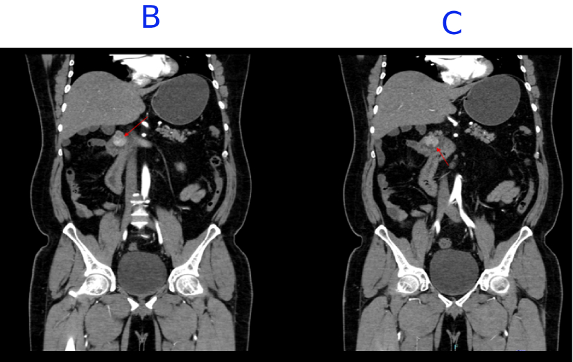 - Small gastric GISTs may show intense enhancement with IV contrast administration; this is a less common finding in the small bowel, probably because enteric tumors are larger and more malignant at presentation.