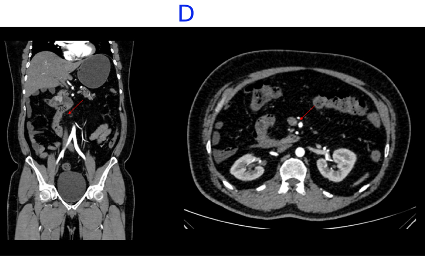 D. Incidental note of malrotation with the duodenojejunal junction lying to the right of the midline and altered SMA-SMV relationship.