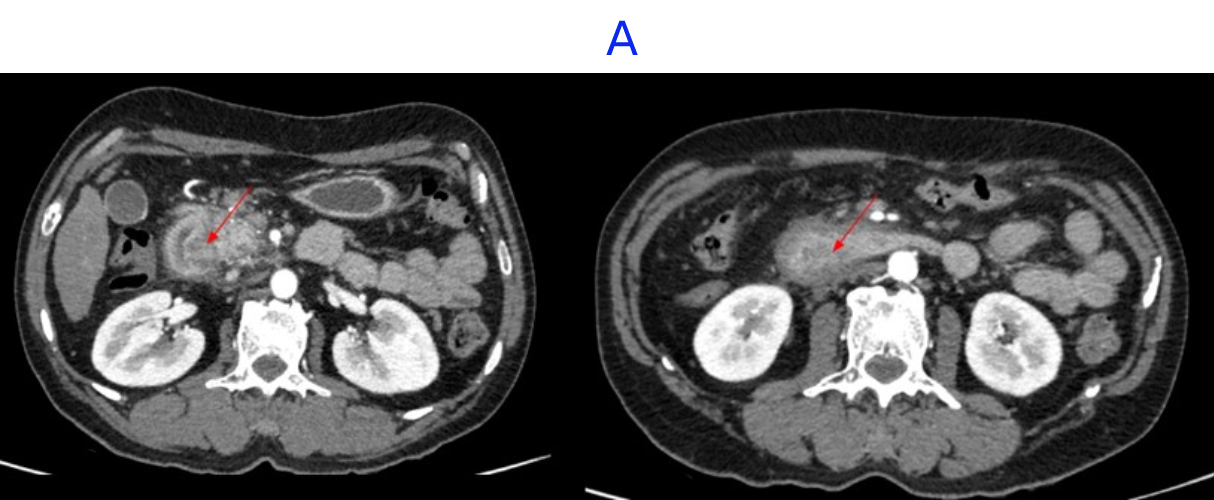 - Presence or absence of biliary and pancreatic duct obstruction degree and morphology of upstream ductal dilatation Effect on adjacent vascular structures -mesenteric and portal veins and the pancreaticoduodenal artery Rarer ancillary features such as abnormal air, hemorrhage, and fistulization can also be helpful if present.